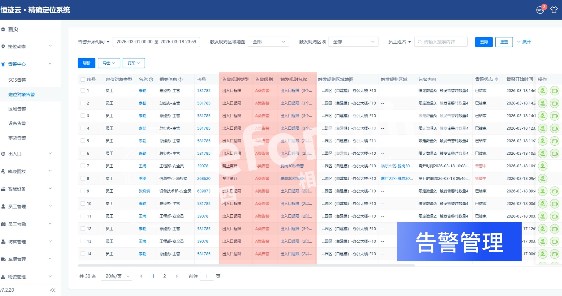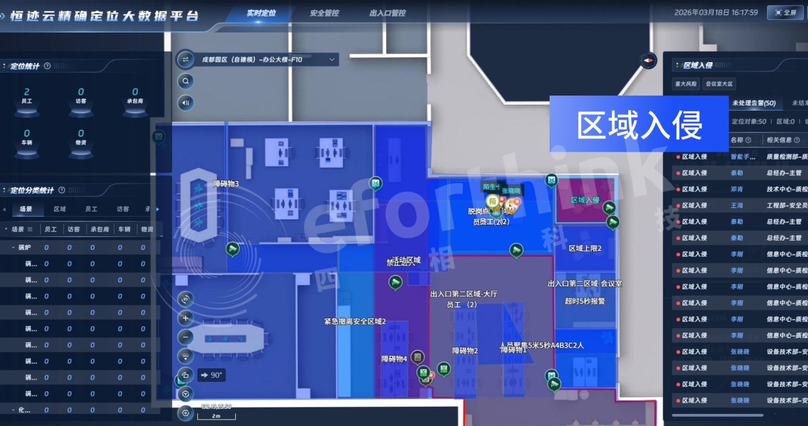 系统可按人员身份(员工、承包商、访客等)精准配置区域访问权限。非权限人员闯入限制区域,系统0延迟触发入侵告警,同步弹出触警人员实时位置、身份信息,帮助管理人员第一时间锁定目标。同时向触警卫人员发送越界提醒,实现双向快速响应。
