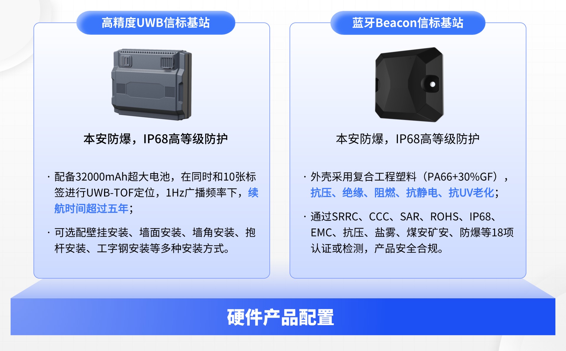 信标设备采用内部电池供电,外部无线信号传输,部署过程无需任何布线,实现快速部署便捷运维;基站采用DC+光纤通信或POE通信技术,组网灵活便捷。